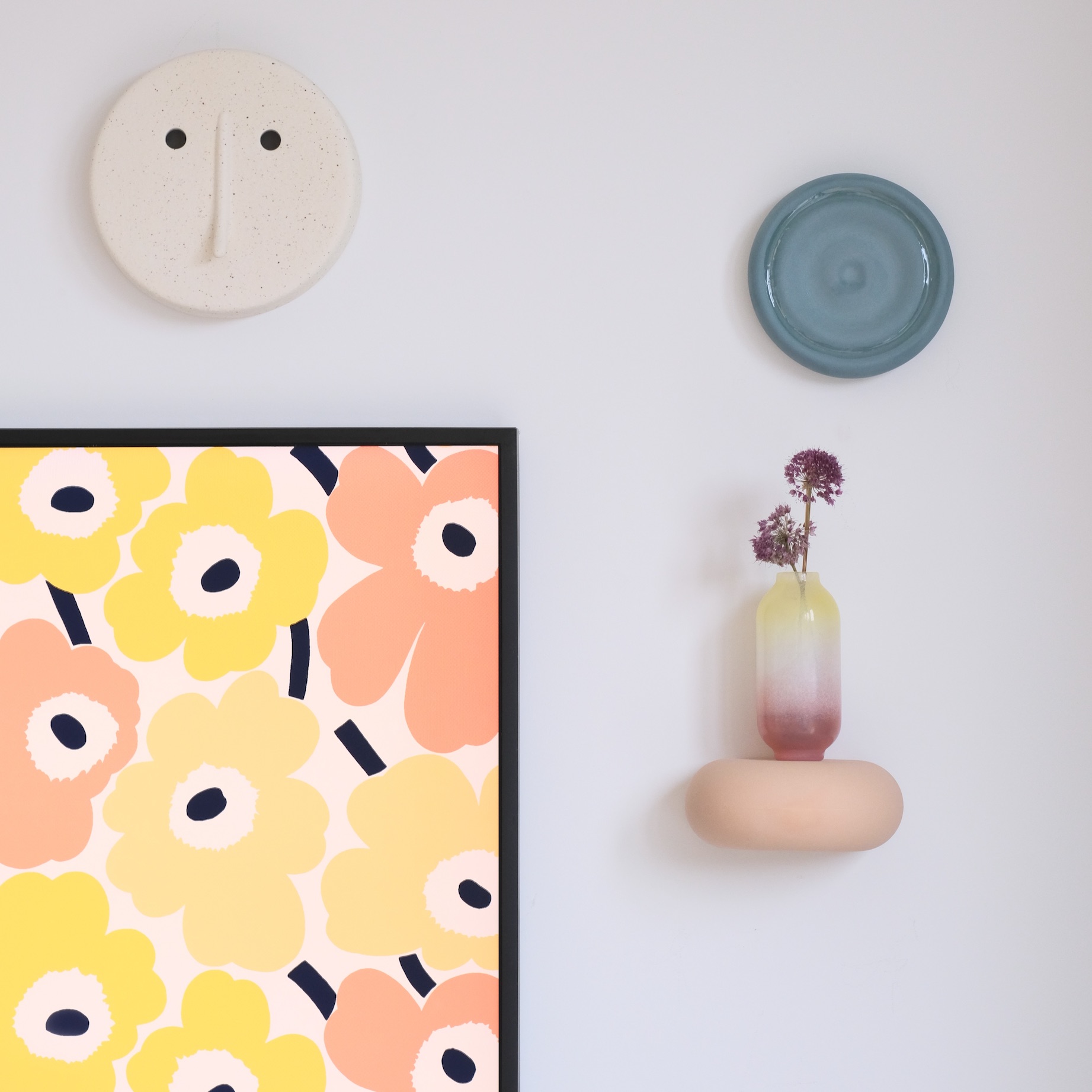 Voeg een levendig en gedurfd accent toe aan je ruimte met dit ronde kunstwerk aan de muur. Rene is niet alleen een mooie verrijking, maar ook een handige en prachtige houder voor andere decoratieve items. Laat de kleurenpaletten van andere kunstwerken of keramiek harmonieus terugkomen op je muur door een wandplankje uit te kiezen in een soortgelijke kleurtoon. Wandplankje Rene is ook leuk te combineren met ons wandplankje Meggie, de grotere variant. En wist je dat onze kleine vaasjes Feline en Elsje precies op het wandplankje passen? Lekker combineren dus!