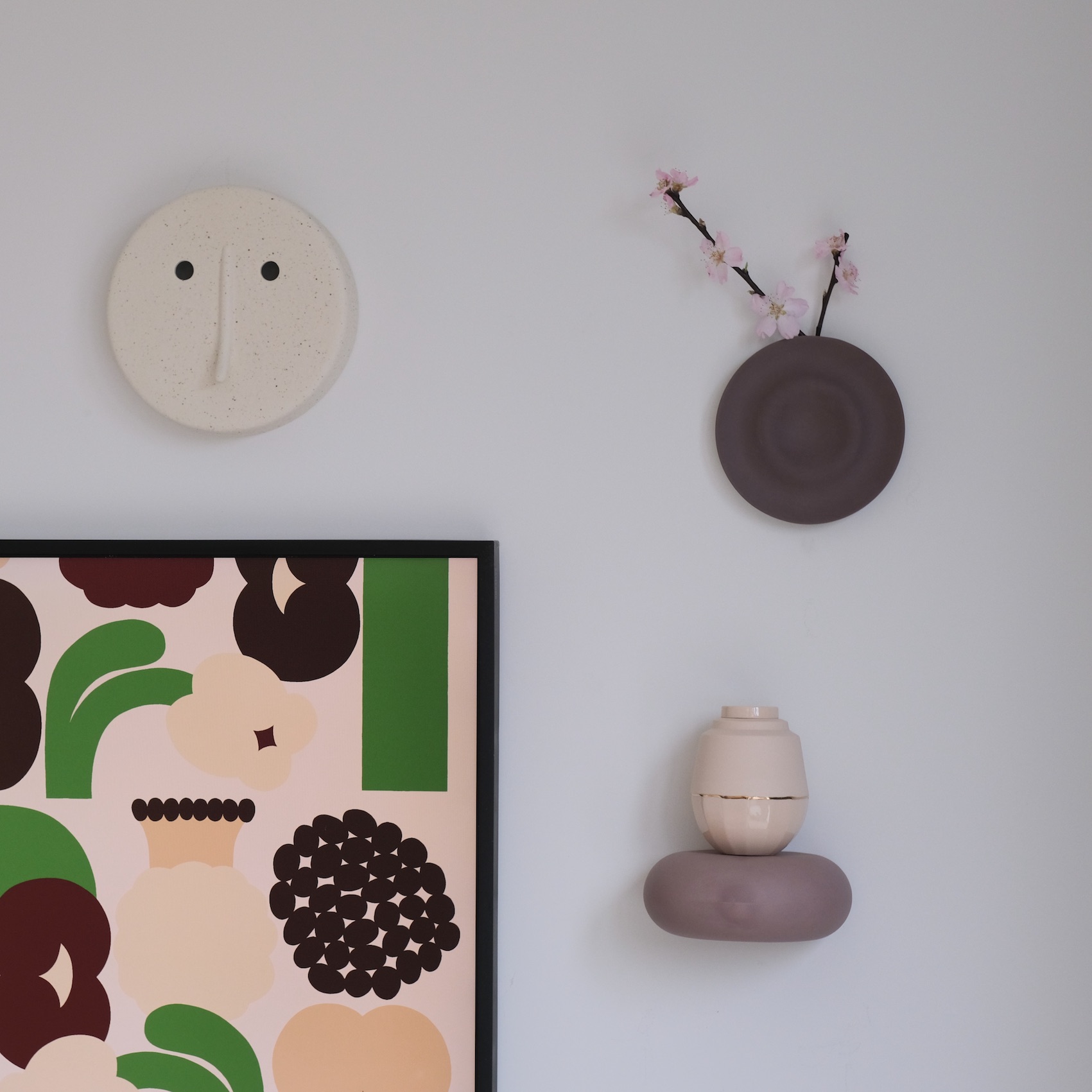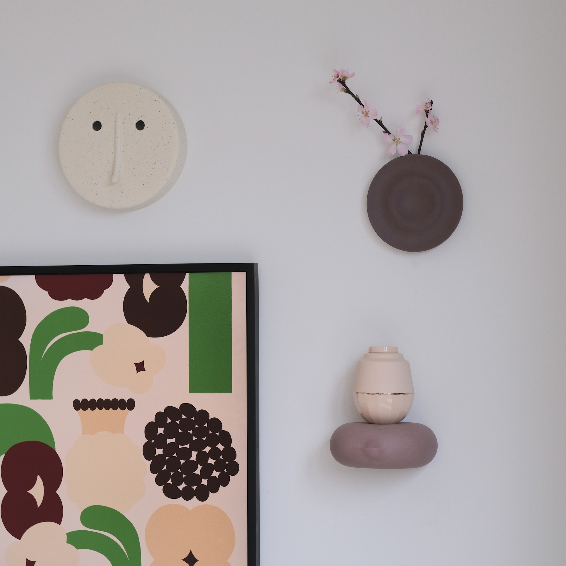 Deze keramieken, ronde wandvaas heeft een opvallende, golvende lijn in het midden, waardoor het een klein kunstwerkje wordt dat zachtheid en kleur toevoegt aan je interieur!